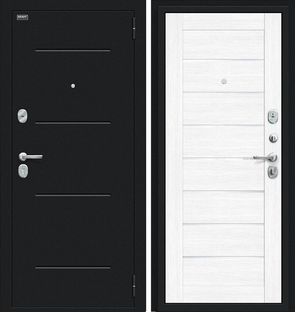 Надежная входная Дверь Браво Техно Букле черное/Snow Melinga премиум класса по цене 31 133 руб. Большая толщина стали защитит от проникновения в ваш дом, квартиру или коттедж. Используется очень качественная фурнитура: замки, цилиндры, ручки, защелки. Покрытие и отделка двери изготовлено под внимательным контролем производителя. Дверь имеет долгий срок службы и гарантию.
